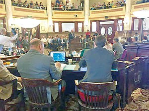 Sen. Chas Vincent, R-Libby, presents a bill Saturday, April 11, 2015, that would ratify a negotiation between tribes and the state and federal governments regarding water rights in northwestern Montana at the Capitol in Helena, Mont. Hundreds testified for and against measure that has been years in the making.