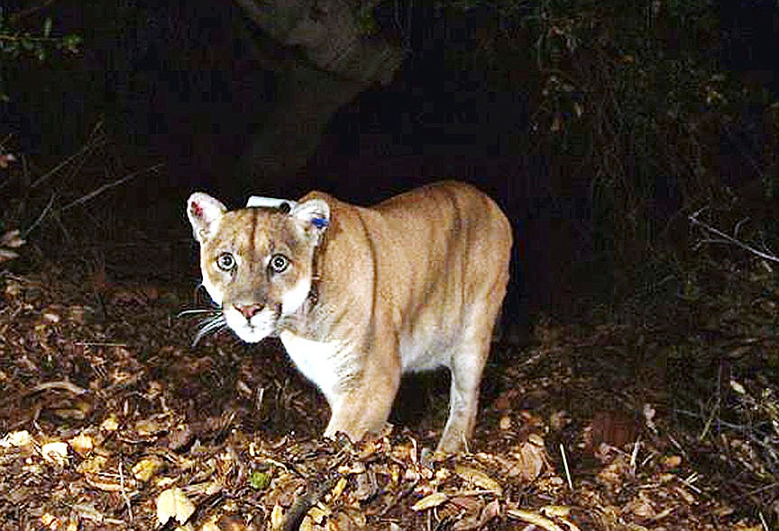 FILE - This Nov. 2014 file photo provided by the National Park Service shows the Griffith Park mountain lion known as P-22. The mountain lion that's a local celebrity has moved in under a Los Angeles home, and despite wildlife workers using a prod and firing tennis balls and bean bags at it, it appears unwilling to move. The animal, which has a red ear tag, is known as P-22 and normally lives in nearby Griffith Park. P-22 arrived in the area several years ago from the Santa Monica Mountains and crossed two freeways to get there. (National Park Service, via AP, File)
