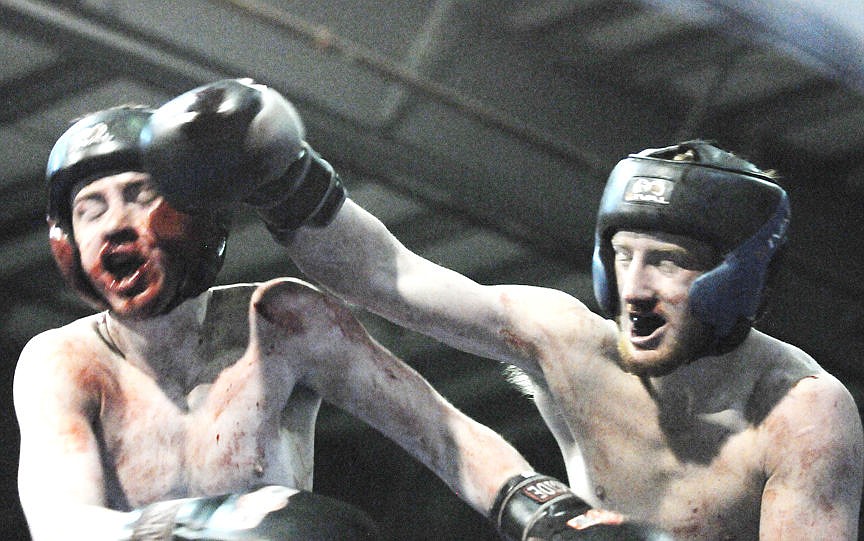 Columbial Falls Colton Sweeney lands a shot on Flathead's Cole Davis during a bout during the sixth annual Crosstown Boxing Smoker at the Flathead County Fairgrounds on Thursday. (Aaric Bryan/Daily Inter Lake)