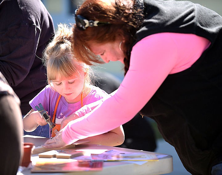 Isabella Profitt, 5, gets help with her planter from family friend Tammy Hovland at the Northwest Montana Head Start Family Fun Day on Friday, April 17, in Kalispell. (Brenda Ahearn/Daily Inter Lake)