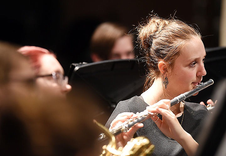 Flathead sophomore Emily Gracheck and members of the Flathead High School Concert Band perform during the District Music Festival on Thursday, April 16, in Kalispell. (Brenda Ahearn/Daily Inter Lake)