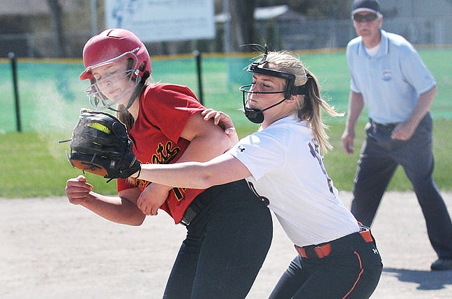 Flathead second baseman Hailey Gauthier catches the ball behind Missoula Hellgate's Sierrah Hardy on a pick off attempt at first. (Aaric Bryan/Daily Inter Lake)