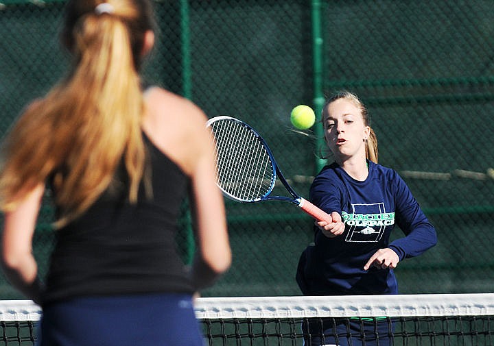 Glacier's Anna Cecil rips a shot at the net during a doubles match at the Kalispell Invite on Saturday. (Aaric Bryan/Daily Inter Lake)
