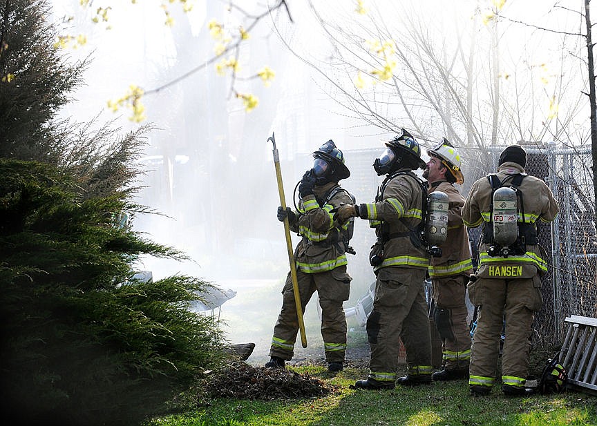 Firefighters survey the fire near the fire pit which is believed to have caused the house fire. (Aaric Bryan/Daily Inter Lake)