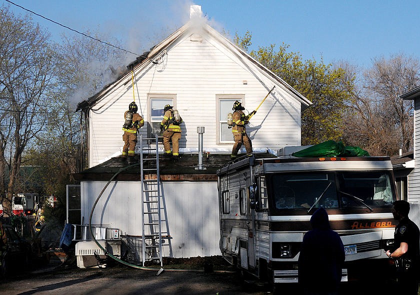 Firefighters work to put the fire out at 715 Sixth Avenue West in Kalispell on Tuesday. (Aaric Bryan/Daily Inter Lake)