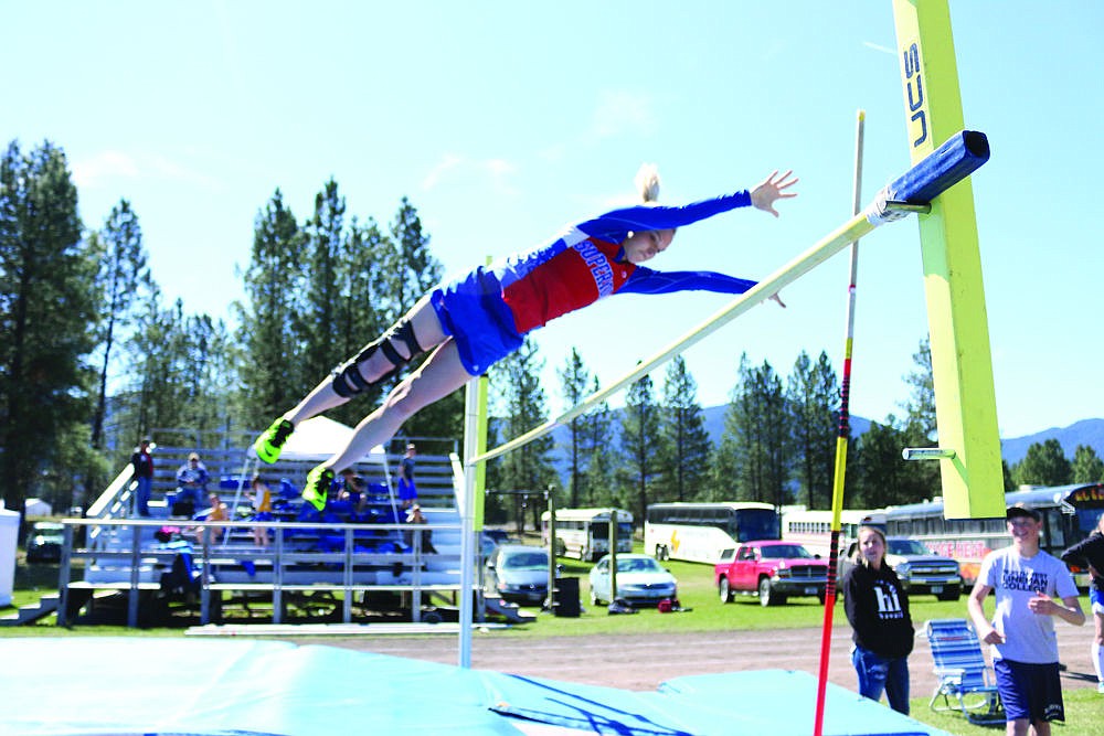 Emma Duboise flies over the bar during the pole vault event last week in Thompson Falls.