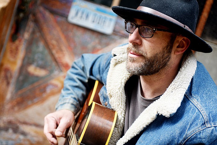 Local bluesman Kevin Van Dort playing outside his home west of Kalispell on April 3.