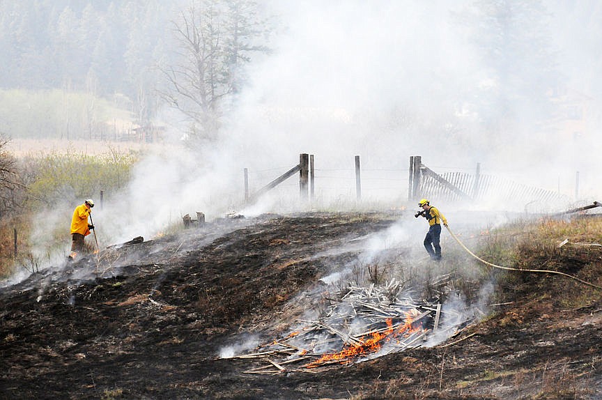 Firefighters work to put out a grass fire south of Kalispell at Ashley Meadows on Wednesday. (Aaric Bryan/Daily Inter Lake)