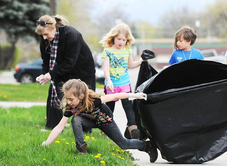 Russell Elementary first-grader Zayta Hill scoops up garbage on Washington Street. (Aaric Bryan/Daily Inter Lake)