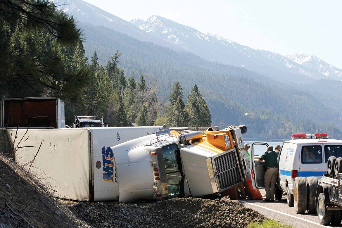 The semi truck rolled on its side Thursday morning 5 miles south of Yellow Bay, blocking one lane of Montana 35.