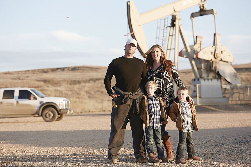 In this November, 2014 photo, Ben and Phoebe Moorhead pose for a photo with their boys, Falcon, left, and Titan, near an oil well in Sidney, Mont. Ben and Phoebe, who left Phoenix in 2013 for steady work in the Bakken, are part of a six-episode documentary called "Boomtowners" that chronicles the lives of people who live and work in the North Dakota and Montana oil patch. It will premiere Sunday, April 26, 2015 on the Smithsonian Channel. (The Smithsonian Channel via AP)