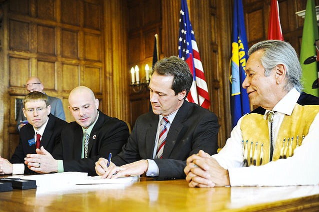Gov. Steve Bullock joined by bill sponsor Sen. Chas Vincent, Rep. Steve Fitzpatrick, left, and Tribal Chairman Vernon Finley, right, signs SB262, the water use agreement among the Confederated Salish and Kootenai Tribes and the state and federal governments, into law Friday April 24, 2015 in the Governor's Reception Room in Helena, Mont. (Thom Bridge/The Independent Record via AP)