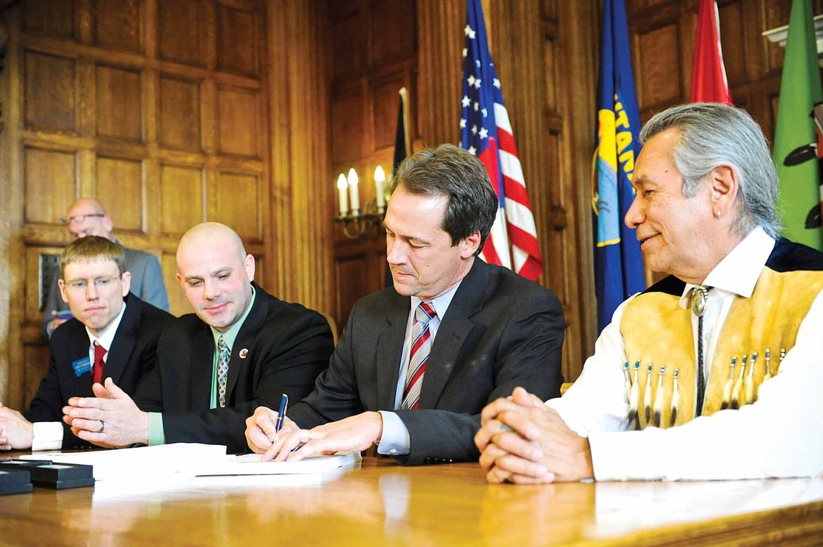 Gov. Steve Bullock signs tribal water compact legislation on Friday joined by, from left, Rep. Steve Fitzpatrick, bill sponsor Sen. Chas Vincent and Confederated Salish and Kootenai Tribal Chairman Vernon Finley. (AP photo)