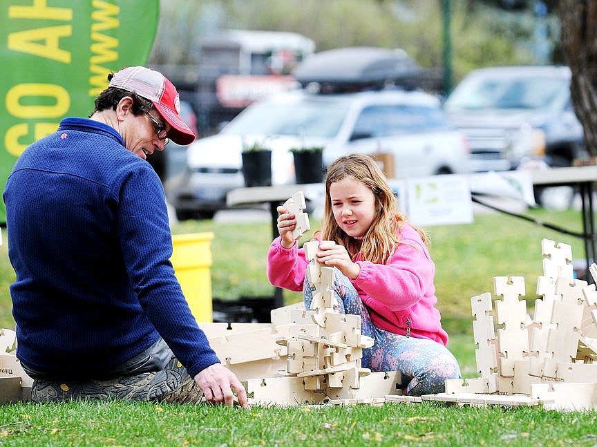Dave and Samara Ritter of Columbia Falls play with the puzzle pieces of the ImagineIF Library booth at the Celebrate the Flathead: Earth Day Event at Depot Park in Whitefish on Saturday. (Aaric Bryan/Daily Inter Lake)