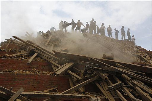 Volunteers work to remove debris at the historic Dharahara tower after an earthquake in Kathmandu, Nepal, leveled the nine-story landmark on Saturday. (AP photo) , April 25, 2015. A strong magnitude-7.9 earthquake shook Nepal's capital and the densely populated Kathmandu Valley before noon Saturday, causing extensive damage with toppled walls and collapsed buildings, officials said. (AP Photo/ Niranjan Shrestha)