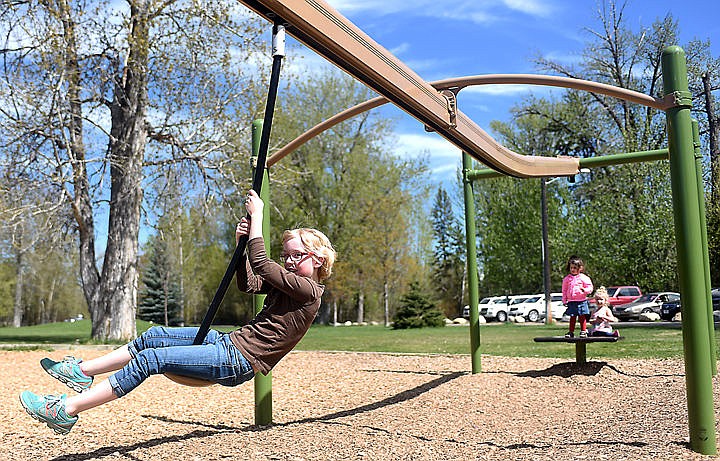 Josephine Yarus, 9, of Eureka, plays at Lawrence Park on Monday, April 27, in Kalispell. (Brenda Ahearn/Daily Inter Lake)