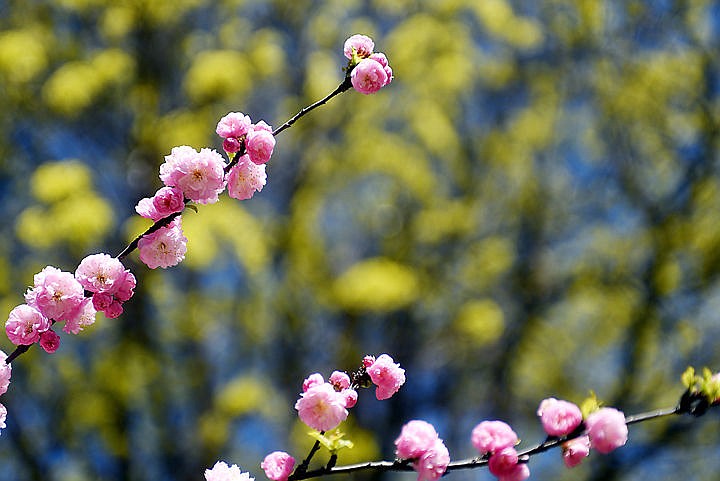 Bright pink flowers make a stark contrast against the bright green new leaves of spring in Kalispell on Monday, April 27. (Brenda Ahearn/Daily Inter Lake)