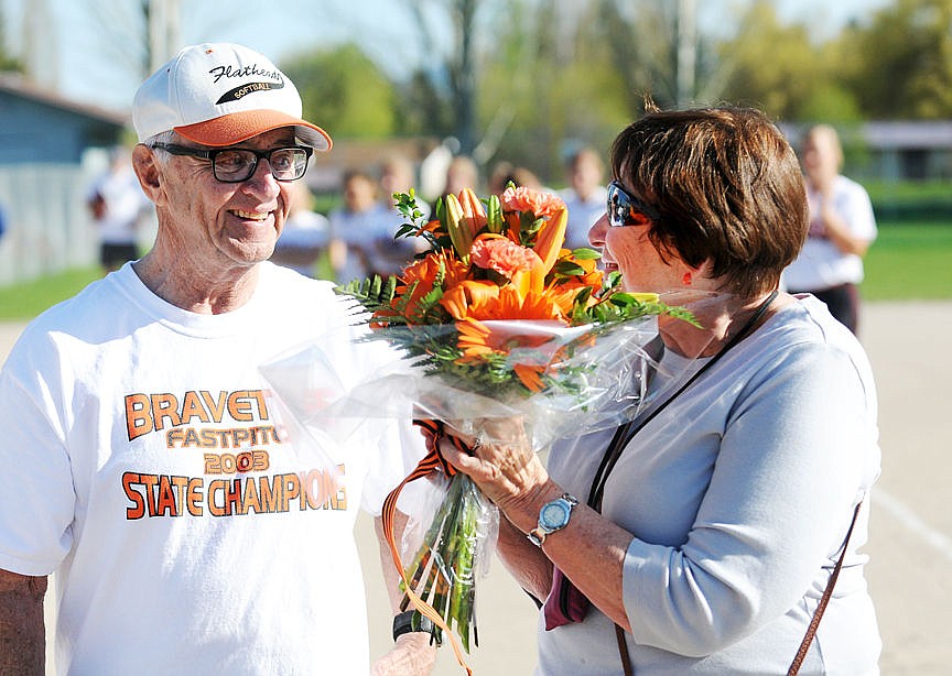 Flathead athletics legend Gene Boyle and his wife, Barb, smile during a dedication ceremony at the Conrad Complex before the Flathead Bravettes softball game on Tuesday. Wherever the Bravettes play home games now will be called Barb and Gene Boyle Field. Gene Boyle spent 45 years in education ranging from activities director at Flathead High School to principal at St. Matthew’s School. He worked with students from kindergarten through 12th grade, coached champions in football, basketball, track, baseball and softball, and organized nearly every kind of school event under the sun. He coached the Bravettes to their only state softball championship in 2003. (Aaric Bryan/Daily Inter Lake)