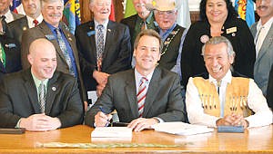 Gov. Steve Bullock signed the bill to ratify the Confederated Salish and Kootenai Tribes Water Compact into law Friday afternoon, despite a lawsuit filed to block the controversial agreement. Bullock was accompanied by Sen. Chas Vincent, who championed the bill through the Legislature, and by tribal chairman Vernon Finley.