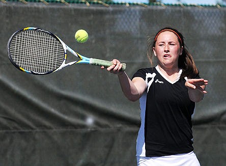 Flathead's Ellie Berreth smashes a return in her match against Shelby Odell on Tuesday. Berreth won the match 6-0, 6-1. (Aaric Bryan/Daily Inter Lake)