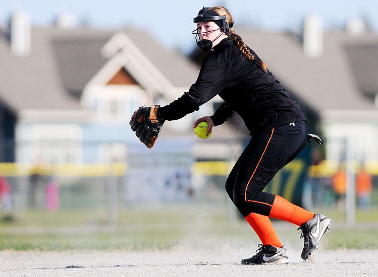 Flathead shortstop Kylee Meredith loads up to throw out a runner at first at Whitefish in the bottom of the first inning. (Aaric Bryan/Daily Inter Lake)