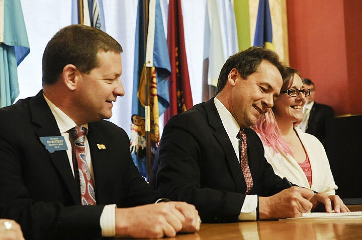 Democratic Gov. Steve Bullock, center, signs a bill to expand Medicaid to about 70,000 low-income Montanans on Wednesday, April 29, 2015 at the Capitol in Helena, Mont. as bill sponsor Republican Sen. Ed Buttrey, left, of Great Falls looks on. (Thom Bridge/Independent Record via AP)