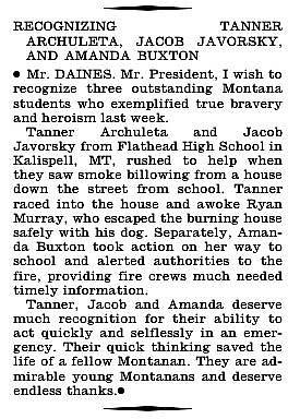 “Tanner, Jacob and Amanda deserve much recognition for their ability to act quickly and selflessly in an emergency,” Daines said in the official record. “Their quick thinking saved the life of a fellow Montanan. They are admirable young Montanans and deserve endless thanks.”