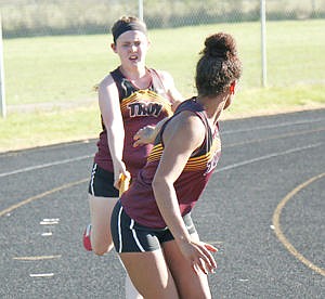 Makayla Henson, left, hands off to anchorman Olivia Roach in the 400-meter relay, county track meet April 28.
