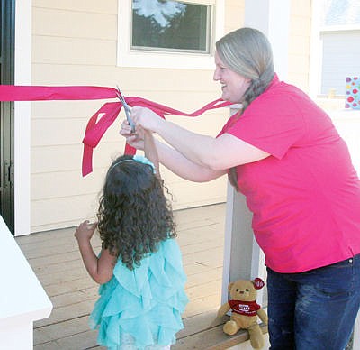 Jennifer Holm with the help of her daughter Jazmine Holm cut the ribbon to their new Habitat for Humanity home, July 31, 2015.