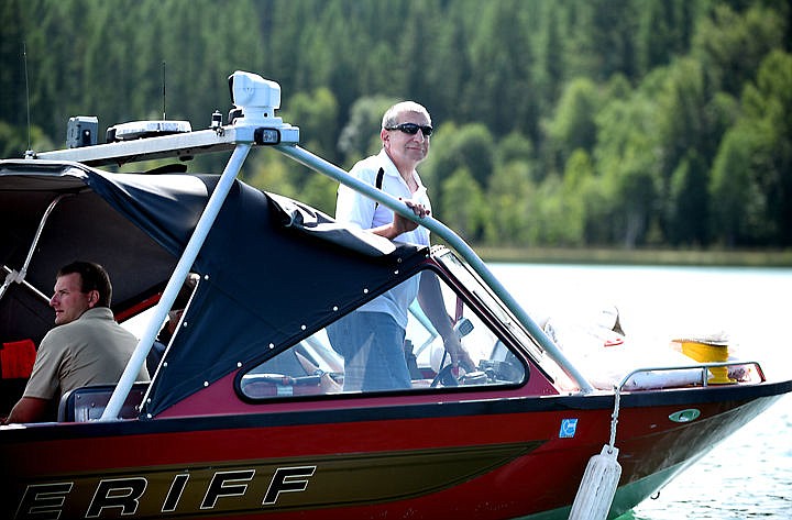 Flathead County Sheriff Chuck Curry, right, and Search and Rescue Coordinator Brian Heino and others take part in the search for a downed helicopter in Beaver Lake on Wednesday, August 5, north of Whitefish. (Brenda Ahearn/Daily Inter Lake)