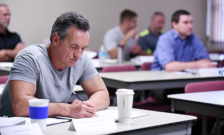 Mark Moriarty of Next Level Fitness takes notes in session two of the Profit Mastery course with John Balsam on Thursday, August 6, at Flathead Valley Community College. (Brenda Ahearn/Daily Inter Lake)