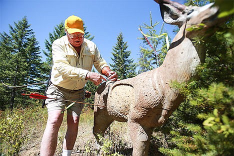 The club hosted its third and final 3-D shoot of the year Aug. 1-2 on state land adjacent Farragut State Park. About 300 people attended the "3-D Fall Warmup and Fun Shoot," where they trekked along two separate loops to fire their field-tipped arrows at life-sized targets. Each loop contained 20 different targets, ranging from the small, lifelike rabbit and raccoon targets to the massive moose and moving elk.
