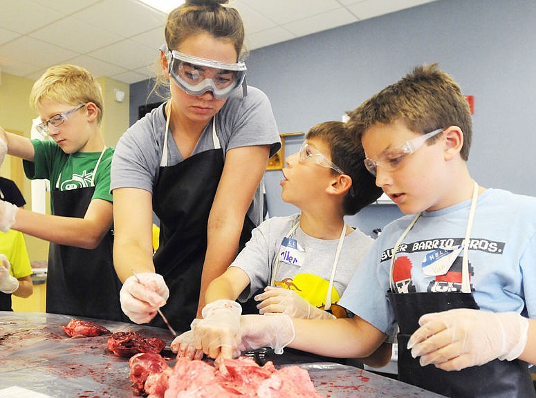 Christine Connolly, a senior at Glacier, helps Miller Bushnell, left and Van Scholten with a dissection during Science Games. (Aaric Bryan/Daily Inter Lake)