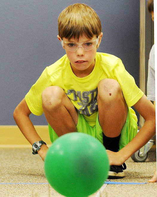 Winston Gray watches his car powered by a ballon speed away during the Science Games at Glacier High School on Wednesday. (Aaric Bryan/Daily Inter Lake)