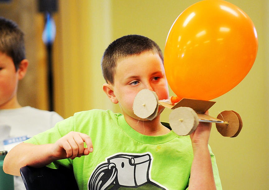 Peyton Bicha blows up his balloon as he prepares to test the car he built during the Science Games at Glacier High School on Wednesday. (Aaric Bryan/Daily Inter Lake)