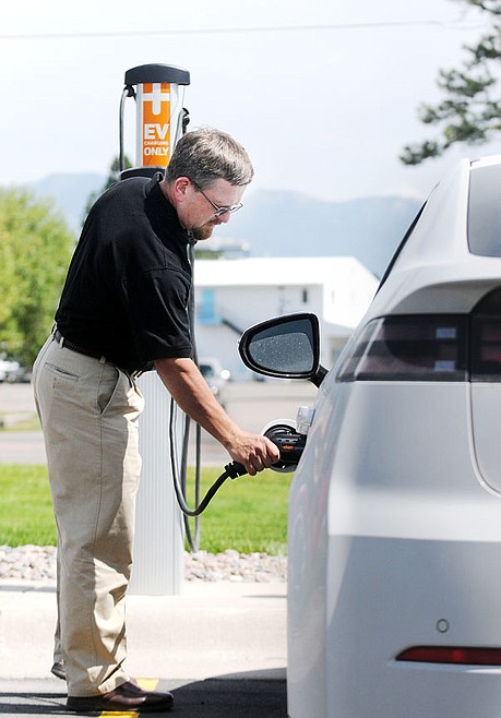 John Goroski recharges his Chevy Volt at a recharging station in front of Flathead Electric Cooperative in Kalispell on Wednesday, Aug. 6, 2015. (Aaric Bryan/Daily Inter Lake)