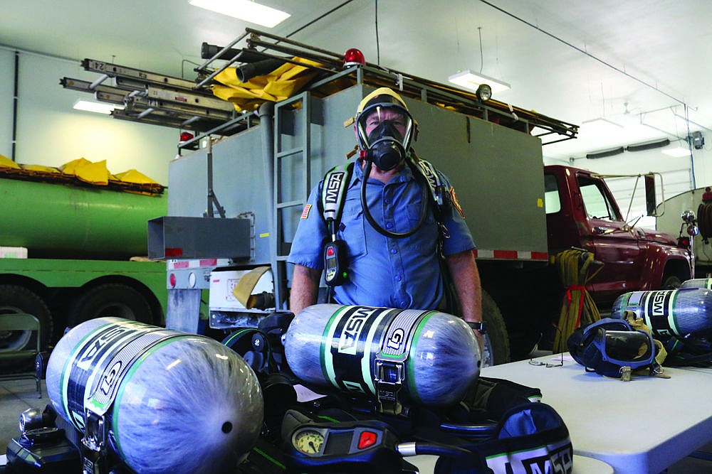 Interim Superior Volunteer Fire Chief John Woodland demonstrates the new SCBAs the department received recently due to a grant.