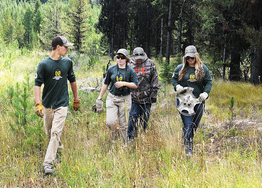 The crew picks up a discarded rim that was used for target practice near the Sylvia Lake Trailhead. (Aaric Bryan/Daily Inter Lake)