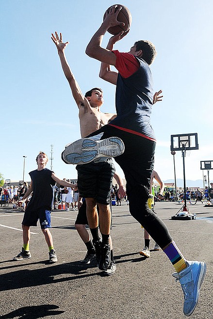 Oz Allen of Professional Plastics goes up for a shot as Not You's Caleb Gwynn tries to block the shot during a 9th-10th grade game at the Kalispell Firefighter 3-on-3 Tournament. (Aaric Bryan/Daily inter Lake)