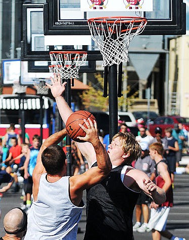 Columbia Falls' Chase Grilley goes to block Zeb Zahns shot during the men's action at the Kalispell Firefighter 3-on-3 Tournament. (Aaric Bryan/Daily Inter Lake)