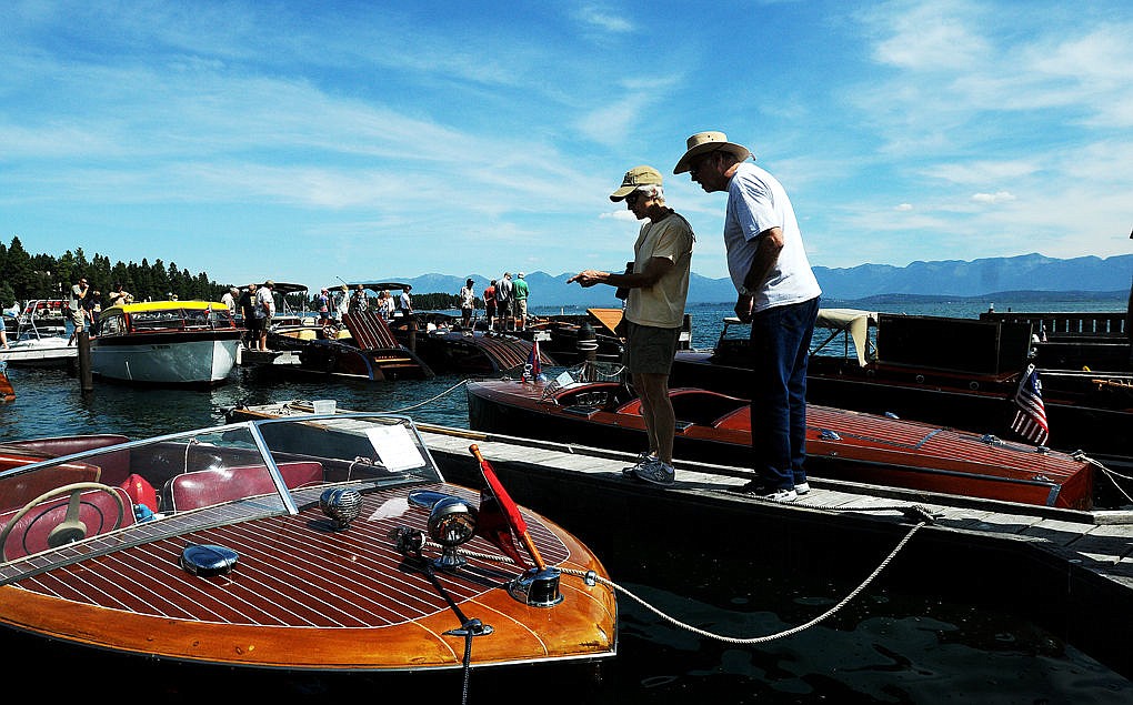 Chuck Edwards and Margaret Parodi examine the 1952 Chris Craft "Emotion," during the Big Sky Antique and Classic Boat Show in Lakeside on Saturday. (Aaric Bryan/Daily Inter Lake)