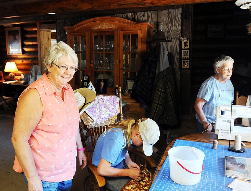Linda Stewart helps her grandaughter Grace Stewart with her quilt she plans to enter in the Northwest Montana Fair at the Stewart's home recently. Linda's mother, Sherry Caverly, background, was also helping with the projects. (Aaric Bryan/Daily Inter Lake)