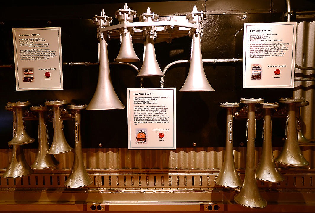 Visitors to Amtrak Days in Whitefish will get to interact with some of the history of the trains including this display which features various train horns that sound when buttons are pushed. (Brenda Ahearn/Daily Inter Lake)