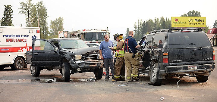 A collision at U.S. 2 and Birch Grove on Friday evening, August 14, north of Kalispell. A north bound Toyota truck ran a read light and struck a Chevy SUV that was heading west bound on Birch Grove. (Brenda Ahearn/Daily Inter Lake)