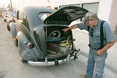 Russ Dawson of Clarks Fork, Idaho points to the original spare tire that came with his '38 Plymouth. Oh yeah, and it has a mere 52,000 original miles to boot!