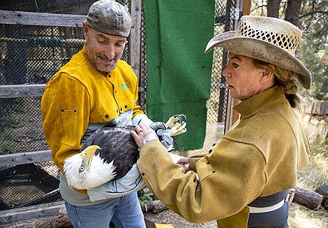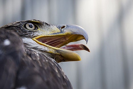 B.B., nicknamed for where he was found in Bottle Bay near Sandpoint, is one of about a dozen eagles in the care of Birds of Prey Northwest, a Coeur d'Alene-based, volunteer-run nonprofit that rescues and rehabilitates raptors while promoting stewardship and conservation of these special birds through educational programs. The facility, located outside St. Maries, is at a record for golden and bald eagles. Veltkamp said Birds of Prey usually sees three to six in a whole year and three wound up at the facility just in the last week or so.