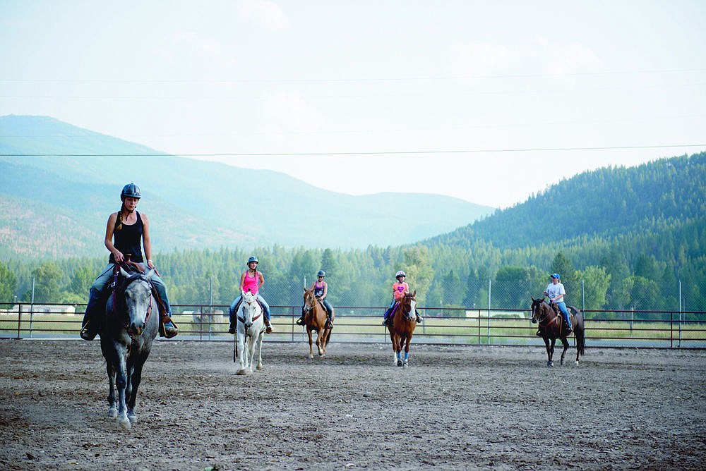 Members of the 4-H Horse Club ride around the arena at the Sanders County Fairgrounds.