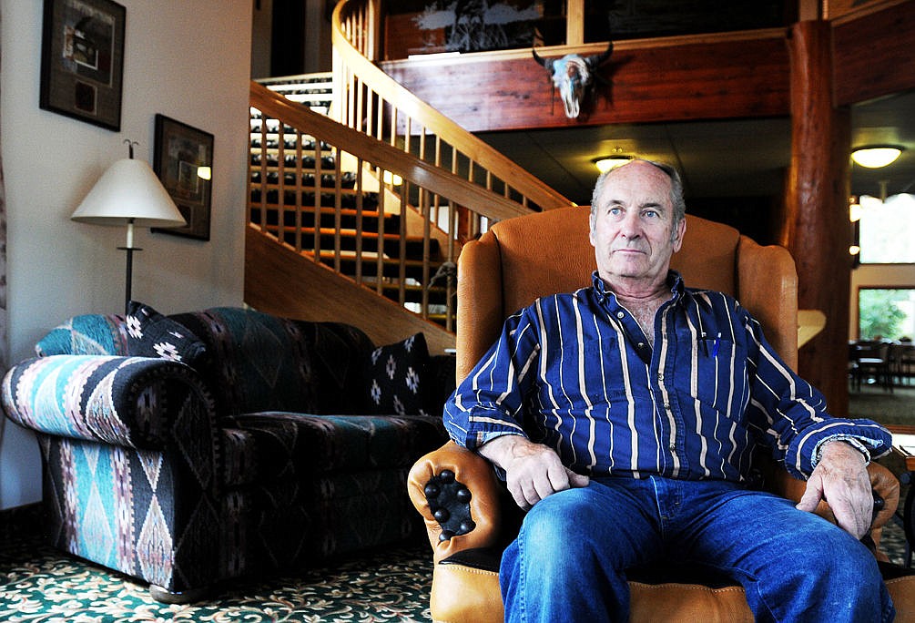 Dennis Rasmussen sits on a chair that was reupholstered with buffalo hide in the lobby of the Greenwood Village Inn and Suites. (Aaric Bryan/Daily Inter Lake)