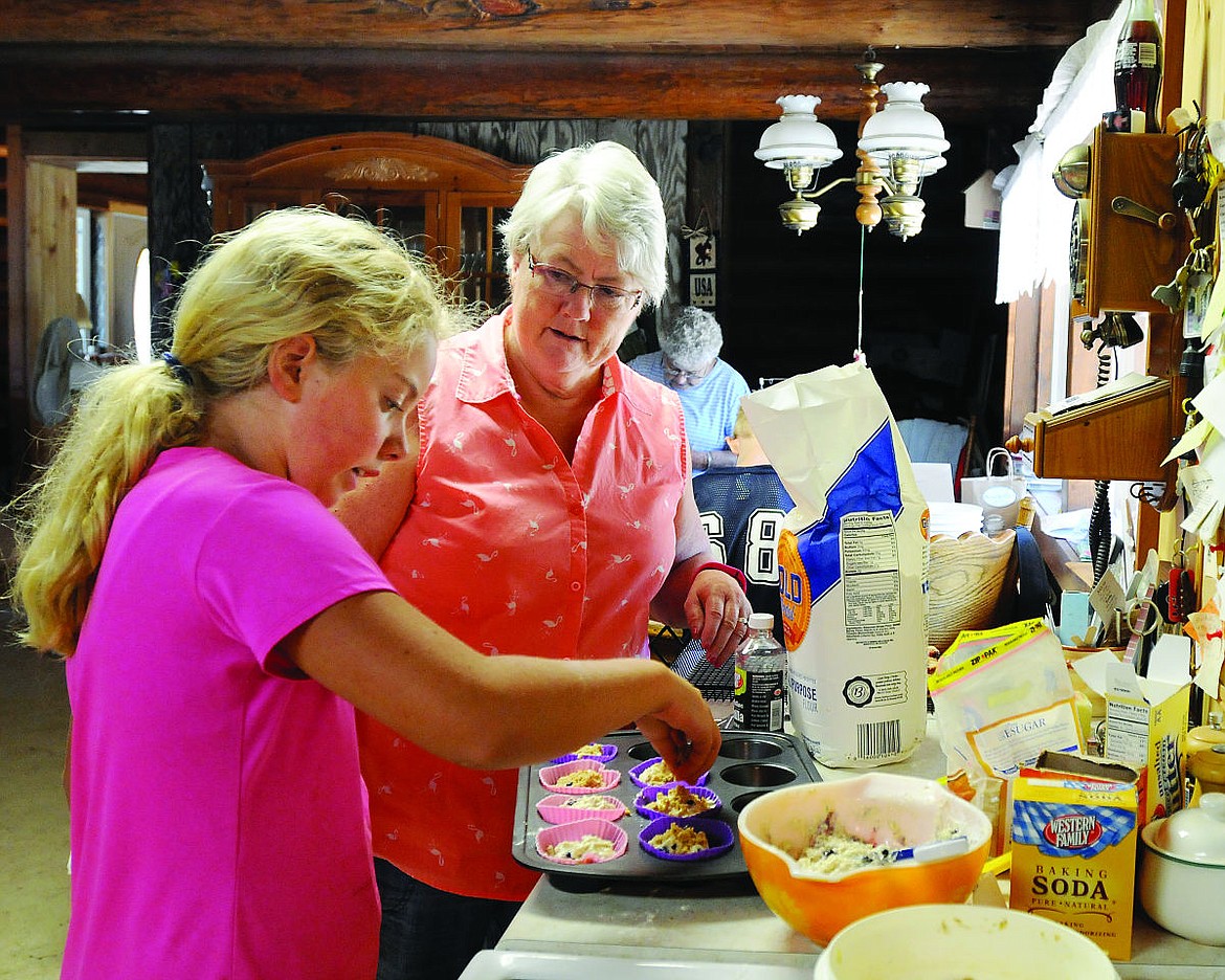 Linda Stewart helps her granddaughter Delcy Stewart with the huckleberry muffin recipe she plans to enter in the Northwest Montana Fair.