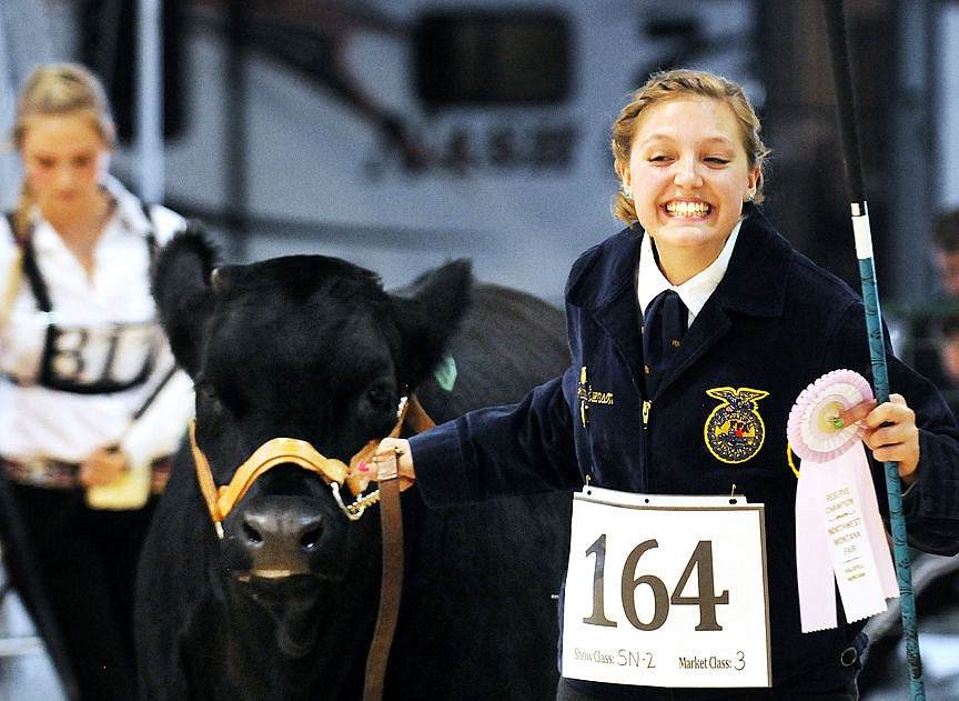 Jayme Evenson of the FFA smiles after winning the Reserve Grand Champion in the senior novice showmanship during the Northwest Montana Fair on Tuesday. (Aaric Bryan/Daily Inter Lake)